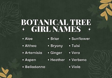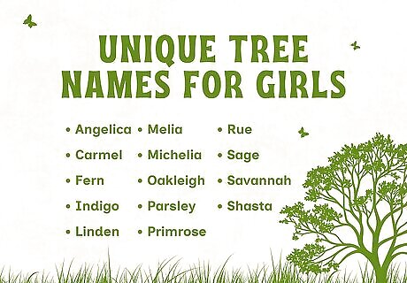Choose names that feel distinct. Many tree and greenery-related names aren’t the first ones you think of, but these cool girl names are definitely worth looking at. Carmel is a good example, meaning “garden” in Hebrew. Others include Michela, the name for a group of evergreen trees, or Sage, an herb which also means “wisdom.” Angelica - Name for a Japanese shrub-like tree. Carmel - Means “garden” or “orchard” in Hebrew. Fern - Plant associated with sincerity and good fortune. Indigo - A deep blue color taken from the indigo plant. Linden - Another name for a “lime tree.” Melia - Greek name for an “ash tree.” Michelia - A grouping of evergreen trees and shrubs. Oakleigh - A feminine spelling of “oak meadow.” Parsley - A leafy, green herb. Primrose - Means “first rose” in Old English. Rue - Known as the “herb of grace.” Sage - An herb which also means “wisdom.” Savannah - Taken from the Spanish “sabana,” meaning “grassland.” Shasta - A type of red fir tree.