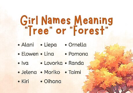 Diversify your name search with names for trees in other languages. Names like the Cornish Elowen refer to an “elm tree,” which Liepa means “linden tree” in Latvian. Some are more specific, like the Italian Ornella, which means “flowering ash tree,” or Randa, which is Arabic for a “scented tree.” Alani (uh-LAH-nee) - Means “orange tree” in Hawaiian. Elowen (El-OH-en) - Means “elm tree” in Cornish. Iva (EE-vah) - Means “willow tree” in Slavic. Jelena (YEH-leh-nah) - A Slavic name meaning “fir tree.” Kiri (KEE-ree) - In Maori culture, it means “skin of a tree.” Liepa (LEE-eh-pa) - Means “linden tree” in Latvian. Lina (LEE-nah) - Arabic for “palm tree.” Lovorka (LOH-vohr-Kah) - Means “laurel tree” in Croatian. Moriko (MOH-ree-koh) - A Japanese name meaning “forest child.” Oihana (oi-HAH-Nah) - Means “forest” in Basque. Ornella (or-NEL-luh) - An Italian name for a “flowering ash tree.” Pomona (puh-MOH-Nuh) - Originated as a Roman name meaning “fruit tree.” Randa (RAN-dah) - Arabic for “scented tree.” Taimi (TAY-mee) - Means “young tree” in Finnish.