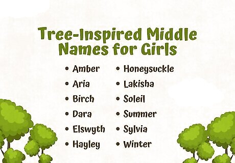 Be bold when it comes to choosing a vibrant middle name. The best part about a middle name is that you don’t have to use it every day. It’s an invitation to names like Elswyth, meaning “elf from the willow tree” in Old English. Others are nature-focused, like Summer, Soleil, and Sylvia, meaning “woodland.” Amber - Means “fossilized tree resin.” Aria - A group of trees found in the rose family. Birch - An Old English name for a tree associated with new beginnings. Dara - Means “oak tree” in Irish. Elswyth - Means “elf from the willow tree” in Old English. Hayley - An Old English name for “hay meadow.” Honeysuckle - A plant symbolizing “bonds of love.” Lakisha - An Arabic name associated with the cassia tree. Soleil - A French name meaning “sun,” to represent what a tree loves most. Summer - A plant’s favorite season, based on the Old English “sumor.” Sylvia - Taken from the Latin “sylvus,” meaning “forest” or “woodland.” Winter - Also means “to wet,” to match the snowy season.