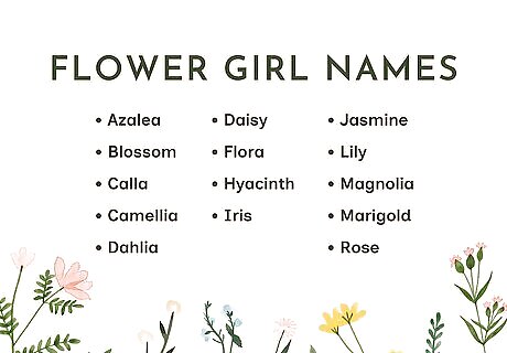 Accompany tree names with beautiful flower names to match. You can’t have trees, plants, and bushes without considering the many flowers that often grow nearby. Some of the prettiest flower names include Dahlia, Daisy, and Jasmine. Others, which are less common, are Hyacinth, Magnolia, and Marigold. Azalea - From the Greek “azaleos,” meaning “parched,” for this thirsty flower. Blossom - Means “to flourish” as only a flower can. Calla - From the Greek “kallos,” meaning “beauty”; part of the name for a Calla lily. Camellia - The Latin name for a “flowering shrub.” Dahlia - The name given to “Dahl’s flower.” Daisy - Means “day’s eye” in Old English.” Flora - The Roman personification of blossoming plants. Hyacinth - Based on the Greek mythological figure Hyacinthos, a youth loved by the god Apollo. Iris - The Greek personification of a rainbow.” Jasmine - Means “gift from God” in Persian. Lily - Symbolizes beauty and innocence. Magnolia - Known for its large white blossoms. Marigold - A combination of the words “Mary’s” and “gold.” Rose - The basis for many Rose girl names, like Rosemary and Rosie.
