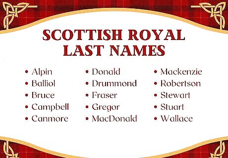 These royal last names come from Scotland’s history. While not the most popular or well-known rulers, the Scottish have some powerful and enchanting royal surnames. The names below may serve as inspiration for characters with Scottish backgrounds or ancestry: Alpin (Scottish for “fair” or “white”) Balliol (French for “fortification”) Barclay (Scottish for “birch tree meadow”) Bruce (Norman-French for “the willowlands”) Campbell (Gaelic for “cam” or “crooked mouth”) Canmore (Scottish for “big head”) Donald (Scottish for “world-mighty”) Drummond (Scottish for “high ground”) Fraser (Scottish for “strawberry”) Gregor (Greek for “watchful” or “vigilant”) MacDonald (Gaelic for “son of Donald”) MacGregor (Gaelic for “son of Gregor”) Mackenzie (Gaelic for “son of Coinneach”) Macrae (Scottish for “son of grace”) Murray (Scottish for “settlement by the sea”) Robertson (Scottish for “son of Robert”) Stewart (English for “steward”) Stuart (English for “steward”) Wallace (French for “foreigner”)