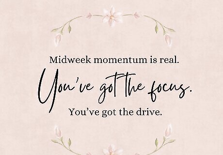 Share a motivational Wednesday quote for a midweek energy boost. If it feels like the weekend just cannot get here soon enough, an inspirational quote or message can help you and others push through until that glorious Friday afternoon. Here are some ideas to get you started: “Happy Wednesday! I think I can see the weekend from here.” “Don’t wait for the weekend to chase your goals. Midweek is prime hustle time.” “Midweek momentum is real. You’ve got the focus. You’ve got the drive.” “Push through the doubt and into the doing. Happy Wednesday!” “Good morning and happy Wednesday! It’s the perfect day to start something new, take a risk, or pursue a dream. Don’t be afraid to step out of your comfort zone and make things happen.” “Happy Wednesday! Remember, the only limit to what you can achieve is the limit you set for yourself. So go out there and make this day a success!” “Happy Wednesday, my friend! No matter how difficult your path may seem, always believe in your strength and resilience. You are capable of overcoming any obstacle.” “Good morning, everyone! Let’s embrace this Wednesday with a positive attitude and a can-do spirit. We are capable of achieving great things if we put our minds to it!” “Hey there, happy Wednesday! Life is too short to waste on negativity and self-doubt. Choose to focus on the positive and let your light shine!” “Happy Wednesday! Let’s use today as an opportunity to inspire and motivate each other. Together, we can accomplish great things!” “Good morning, my fellow dreamers! Keep your eyes on the prize and your heart on your vision. With hard work and determination, anything is possible.” Happy Wednesday, friend! Don’t let setbacks or failures discourage you. Remember, every challenge is an opportunity to learn and grow.” Happy Wednesday, my beautiful souls! Let’s spread kindness, positivity, and love wherever we go. The world needs more of that!” Good morning, friends! Let’s make this Wednesday a day of gratitude and appreciation. Take a moment to be thankful for all the blessings in your life, big and small.” “Turn 'It's only Wednesday' into 'It's already Wednesday!' with enthusiasm.” “Sending a big virtual hug your way this morning. Hope your Wednesday is wonderful!”