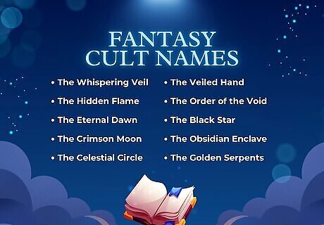 Pick a mysterious name for your cult. If your cult is going to play a big role in your TTRPG or another fictional world, choose a name that’s dark and mysterious. Try to avoid using the word “cult,” as you likely don’t want it to be obvious to your characters…. Here are some examples: The Whispering Veil The Hidden Flame The Eternal Dawn The Crimson Moon The Silver Key Brotherhood The Celestial Circle The Veiled Hand The Order of the Void Keepers of the Forgotten Truth The Black Star The Obsidian Enclave The Golden Serpents The Starlight Covenant The Iron Rose Followers of the Twin Moons The Fellowship of the Frozen Flame The Labyrinthine Path The Raven’s Shadow The Luminaries The Order of the Sable Star