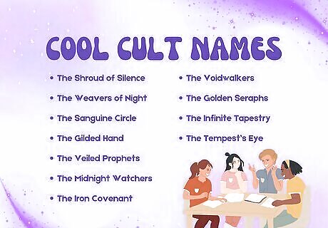 Choose a cool name that reflects their beliefs. If you’re playing a serious game or writing a serious story, give your cult a cool name that shows just how powerful they are. Make sure your name somehow ties into the cult’s beliefs and practices. Here are some examples: The Shroud of Silence The Daughters of the Eternal Moon The Weavers of Night The Path of the Waking Dream The Sanguine Circle The Gilded Hand The Veiled Prophets The Midnight Watchers The Iron Covenant The Scarlet Sisterhood The Voidwalkers The Golden Seraphs The Infinite Tapestry The Tempest’s Eye The Dreamweavers The Court of the Four Winds The Redeemed The Black Earth Society The Final Dawn Children of the End