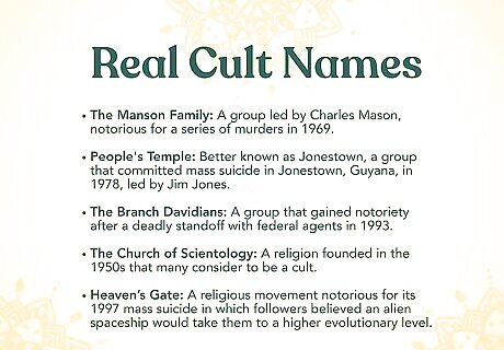 Learn about real cults and their practices. Unfortunately, there have been numerous cults throughout history, many of which have committed heinous crimes. American urban legends podcaster Chelsey Weber-Smith says some of the most infamous cults in the United States include Jonestown, Heaven’s Gate, Scientology, and the Manson family. If you’re creating your own fictional cult, consider studying some of these real-life cults to better understand the inner workings of these groups: The Manson Family: A group led by Charles Mason, notorious for a series of murders in 1969. People's Temple: Better known as Jonestown, a group that committed mass suicide in Jonestown, Guyana, in 1978, led by Jim Jones. The Branch Davidians: A group that gained notoriety after a deadly standoff with federal agents in 1993. The Church of Scientology: A religion founded in the 1950s that many consider to be a cult. Heaven’s Gate: A religious movement notorious for its 1997 mass suicide in which followers believed an alien spaceship would take them to a higher evolutionary level.