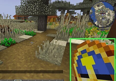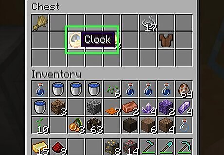 Check the time of day. A clock is made of two halves that spin. The daytime half is blue with a yellow sun, the nighttime half is black with a grey moon. Both halves spin to indicate the current daytime or nighttime cycle. With the yellow sun is in the center, it is noon in the game. When the moon is in the center, it is midnight in the game. Clocks are useful for taking underground when you are mining. They can indicate the current day or night cycle in the game, since it’s easy to lose track of the time-of-day when you are underground, and traveling above ground at night can be dangerous. Clocks do not work in the Nether or the End dimensions. There is no day or night cycle in these dimensions.