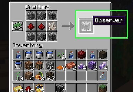 Craft two observers. An observer is a device that produces a signal when something walks in front of it. You can craft an observer from 6 cobblestone blocks, 2 redstone dust, and 1 Nether quartz. You’ll need to craft two observers.