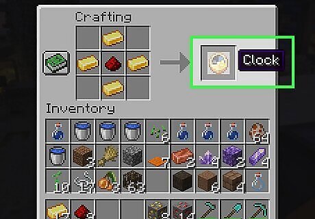 Craft a clock. Once you have at least one redstone dust and 4 gold ingots, you can craft a clock using a crafting table. Open the crafting table and put one redstone dust in the center of the 3x3 grid. Then put one gold ingot in the top-center space, bottom-center space, and left and right-center spaces, surrounding the redstone dust. Drag the clock into your inventory.