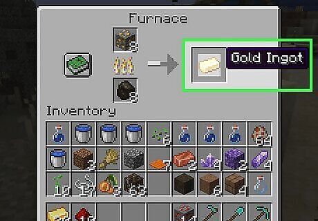 Smelt the gold ore into gold ingots. Smelting is needed to convert the gold ore into usable gold. You can smelt gold ore into gold ingots using a furnace. Open the furnace and place the gold ore in space above the flame icon. Place coal or wood in the space under the flame icon to be used as fuel. Wait for the furnace to finish smelting. Then collect the gold ingots from the furnace. You can craft a furnace out of eight cobblestone blocks using a crafting table.
