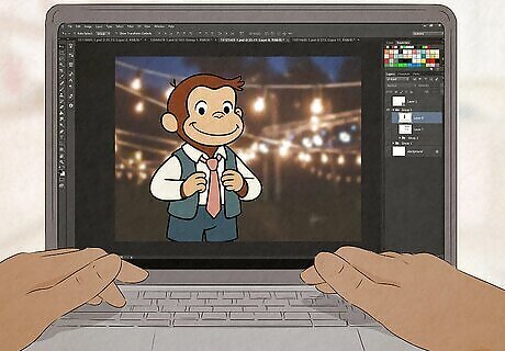 Open an image editor. You can use most image editors that allow you to edit on multiple layers. For this tutorial, we'll use the free website Pixlr. Do the following: Go to pixlr.com/express/ in any browser. Select Open Image and select your original photo. Select + Add Layer in the right panel. Select Image and select the Curious George photo with the removed background. Click and drag the square to resize the Curious George so it's smaller than you. Drag the Curious George to wherever you'd like in the photo, preferably next to you. Click Save at the bottom to save the image to your device.