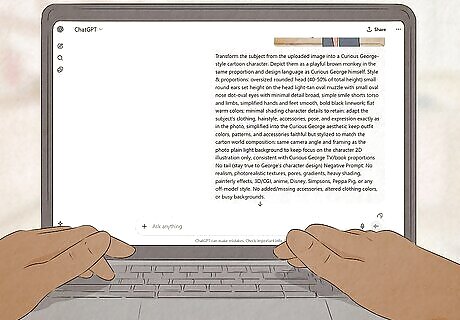 Enter the prompt into the text field and send it. This is a curated prompt that many TikTok users are using specifically for this trend. Copy and paste the following text into ChatGPT: Transform the subject from the uploaded image into a Curious George-style cartoon character. Depict them as a playful brown monkey in the same proportion and design language as Curious George himself. Style & proportions: oversized rounded head (40-50% of total height) small round ears set height on the head light-tan oval muzzle with small oval nose dot-oval eyes with minimal detail broad, simple smile shorts torso and limbs, simplified hands and feet smooth, bold black linework; flat warm colors; minimal shading character details to retain: adapt the subject's clothing, hairstyle, accessories, pose, and expression exactly as in the photo, simplified into the Curious George aesthetic keep outfit colors, patterns, and accessories faithful but stylized to match the carton world composition: same camera angle and framing as the photo plain light background to keep focus on the character 2D illustration only, consistent with Curious George TV/book proportions No tail (stay true to George's character design) Negative Prompt: No realism, photorealistic textures, pores, gradients, heavy shading, painterly effects, 3D/CGI, anime, Disney, Simpsons, Peppa Pig, or any off-model style. No added/missing accessories, altered clothing colors, or busy backgrounds.