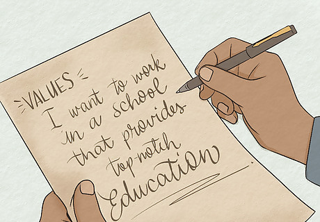 Be clear about the values and norms you expect in a work environment. For a sustainable situation, specify what really matters to you when you’re part of a team. You might feel aligned with a company that’s socially conscious and feel drawn to non-profits. Or, you may love a fast pace, so you want to break into the news industry. Focus on elements of work culture that you’d embrace to find a setting you’ll blossom in. Values: “I want to work in a school that provides top-notch education to kids.” Support: “I’d like to write for a comic book company with collaborative co-workers.” Independence: “I’d like to open my own Etsy store so I have 100% creative control.” Fun: “I want to be a voice-over artist for fast-paced thrillers.” Feedback: “I'd like to be a product designer for a company where I get lots of input.” Rewards: “I want to work for an entertainment company with a benefits package.” Innovation: “I want to be a software dev somewhere that always offers new services.”