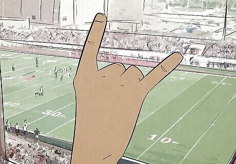 “Horns Down” is a hand symbol used by rivals of the Texas Longhorns. The University of Texas Longhorns use the “Hook ‘Em Horns” as their hand sign—thumb tucked in and index and pinky fingers pointing straight up—to resemble their Longhorn mascot. Teams that play against the Longhorns often invert that sign—index and pinky finger pointing down—as a sign of their rivalry. The Longhorns’ main rivals are the Oklahoma Sooners, Arkansas Razorbacks, and Texas A&M Aggies, but Horns Down is used by a number of other teams that play the Longhorns, as well.