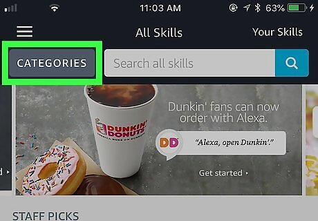 Find a skill in the store. Look through different categories of skills by tapping "Categories" near the top of the screen or search for a particular skill by using the search bar, also near the top.