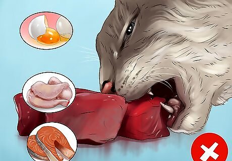 Avoid giving your cat raw meat, fish, and eggs. Diets containing raw beef, pork, chicken, fish, and eggs increase the cat's risk of getting parasites and bacterial infections such as salmonella. Avoid feeding your cat raw meats. Raw diets for cats are controversial, and they are not supported by many vets. Some cats may carry salmonella without getting sick themselves. They can, however, pass it onto humans. If the owners are very young, elderly or have weak immune systems, it is especially important not to feed the cat raw foods. Avoid giving your cat the bones from raw meat, such as chicken bones or fish bones, as they can get caught your cat’s throat and cause choking. It is not recommended that you put your cat on a raw food diet, as this can put your cat at risk of health issues like salmonella poisoning.