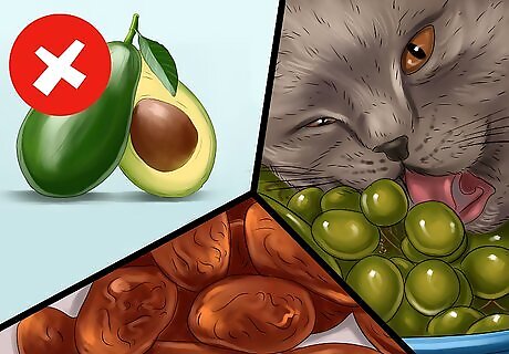 Never give your cat grapes, raisins, or avocados. You may be tempted to give grapes, raisins, or slices of avocado to your cat as healthy treats. Avoid the temptation. These foods can all cause adverse effects in your cat like vomiting, kidney failure, and diarrhea.