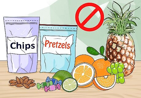 Avoid foods that can irritate your mouth. Some foods have been shown to irritate your mouth, such as nuts, chips, and pretzels. You should also avoid citrus foods like lemons and limes so your mouth does not get irritated. Salty foods, spicy foods, and acidic foods like pineapples, oranges, and grapefruits can also irritate your mouth, leading to the development of canker sores. Try not to suck on candies or chew gum, as these products can irritate your mouth and encourage the development of canker sores. You should also avoid foods you are allergic to, as you may develop allergic reaction that could lead to canker sores and swelling of your mouth or throat.