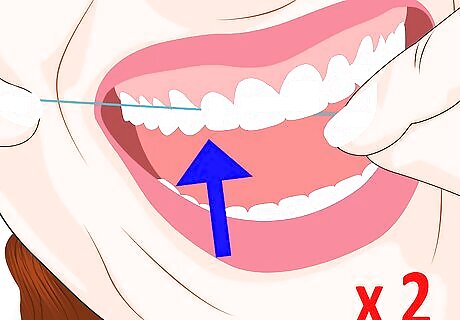 Floss once daily. Floss once each day to prevent food particles from staying in your mouth. These food particles can lead to oral health issues, including canker sores. Get in the habit of flossing before bed as well so your mouth is clean and free of bacteria or food particles. Flossing more than once daily can be harmful to your gums.