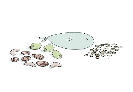 Include plenty of healthy fats in your diet. Many popular diets propose to severely limit all fats. However, some fats are good for you and can help prevent migraines. The fats you want to avoid are saturated or trans fats, such as those in red meat and many dairy products. Unsaturated fats, such as those found in olives, nuts, fish, and seeds, are good for you. Eating seafood 2 to 3 times a week will help you build up omega-3 fatty acids, which in addition to other health benefits can help prevent migraines. Choose wild-caught fish whenever possible for the healthiest option.