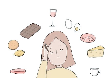 Eliminate common migraine triggers from your diet. Some types of food more commonly trigger migraines than others. While not all of these foods will necessarily trigger a migraine for you, not eating them makes sense. Some of the most common migraine triggers are: Dairy products, especially aged cheese Chocolate and caffeine Aged meats Foods that contain monosodium glutamate (MSG) Eggs Alcohol Citrus fruitsTip: Even though chocolate and caffeine can trigger migraines, they can also be used to treat migraines. Drinking a small coffee or eating a piece of dark chocolate when you feel a migraine coming on may reduce your symptoms.