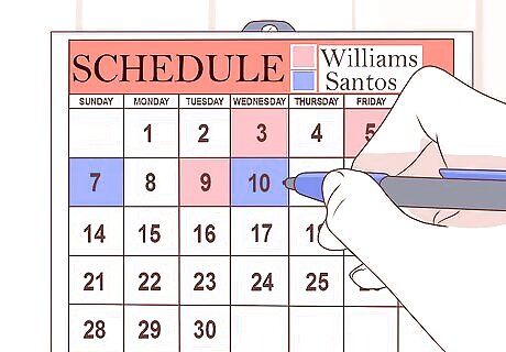 Set up a schedule. As a babysitter, you are likely working for yourself, unless you're a registered childminder, an au pair or a nanny. If you expect to be babysitting a lot, you'll have to make and maintain your own schedule. It may seem old-fashioned but filling out a calendar with all your free days and times, so that when a parent calls to schedule you for babysitting you'll know exactly when you are available is crucial. Creating a color-coding system may be helpful in organizing your ‘busy’ days on the calendar. Update your schedule frequently so that you don’t accidentally double-book yourself. Having a standard schedule with all of your other activities, sports, etc. can also be helpful for parents.