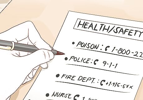 Create a list of health/safety information. You will also need personalized information for each child (such as allergy information), but you should have one generalized list of "worst-case-scenario" phone numbers. Keep all the information in a small notebook, a note-taking app, a binder, etc. so you have it with you at all times. You may want to include: Poison control Police station Fire department Nurse hotline A trusted person who has children (like an aunt or parent) to contact in case of a minor case of confusion Any other relevant numbers Forms for the parents to fill out.