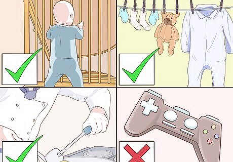 Join in with their play time activities. Although your job is to watch over the children, you should be interacting with them as much as possible by playing with them. Play will vary based on their ages; if you’re watching an infant you may be doing nothing more than making faces and holding up toys. Get creative with the things you come up with for the children to do to keep them interested and out of trouble. Make-believe games are great fun. You could even make up a simple handshake with the children. Be an entertainer. Parents love babysitters who help kids have fun and learn while still reinforcing rules and keeping discipline. Ask kids to show you their favorite toys. Find out from parents and other babysitters what games kids of different ages like to play. Get the kids outdoors if you can. Playing with toys, board games, and activity-based games are all good options for older children. Ask what their favorite thing to do is. You can also bring a few of your favorite games and toys from when you were their age, like Monopoly, Life, Candyland, Uno, or other card games. Stay off screens. Parents are paying you to watch the kid, not put them in front of a television all day.