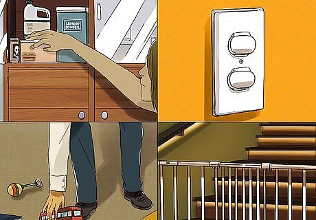 Child-proof your home. To ensure your children are safe at home, make sure you child-proof the space. Use outlet covers and cupboard locks. Put up stair gates to ensure your child is not at risk of falling down the stairs. Keep household cleansers out of reach and small objects off the floor so your child cannot get at them. Try to child-proof your home before your child is born or comes into your home. This way, you will have less to worry about while you are caring for the child. Ask for assistance with child-proofing your home from a friend or family member who is sighted. This may make the process easier and ensure the home is safe for your child.