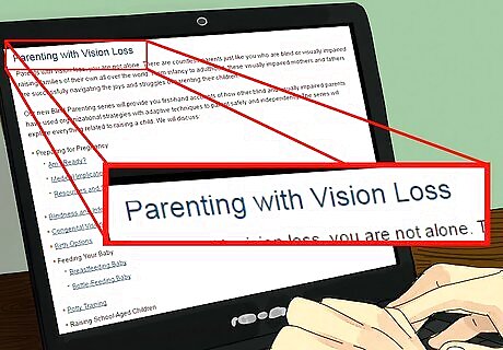 Join a support group. A support group is a good option if you are struggling with your role as a blind or visually impaired parent. Look for a support group for blind or visually impaired parents in your area. Sign up for an online support group so you can communicate with other parents from the comfort of your home. Ask your primary care doctor for a referral to a support group for parents who are blind or visually impaired. Consider becoming a member of a national association for blind or visually impaired parents. There are often support groups, online and in person, that you can find out about through the national association.
