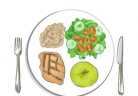 Eat a healthy diet. This will make sure your body has enough energy and strength to train. Cheerleading is a very physical sport that requires a lot of endurance. Therefore, a diet high in carbohydrates, protein, fruits, and vegetables is important. Make sure each meal contains healthy, complex carbohydrates. Your body needs carbs for energy, so eat things like oatmeal, brown rice, whole wheat bread, and other nutrient-rich carbs. Get some fruits and vegetables in with every meal. Have a side salad with lunch. Add some fruit to your morning cereal. Snack on assorted vegetables or fruits between meals. Go for lean sources of protein like low-fat dairy, poultry, and fish. A lot of people think cheerleaders do not eat a lot. This is not the case. If you're going to be working out in preparing for tryouts, a lot of healthy food is necessary for energy. Do not try to restrict your diet too much.