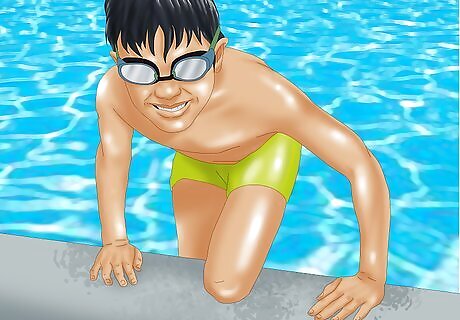 Wear a swim cap. It will protect your hair from drying out and getting discolored from the chlorine and other chemicals in the pool. It will also keep you from releasing oils, dandruff, and skin particles from your hair and scalp into the pool water.