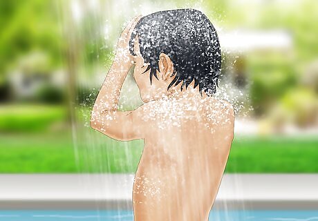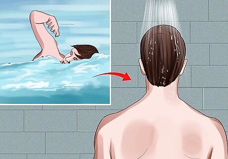 Rinse off after you get out of the pool. Take a shower in the locker room or immediately when you get home. Get the chlorinated water off of your body. You'll also take off other impurities, bacteria, and dead skin cells that can be present even in the cleanest of public pools.