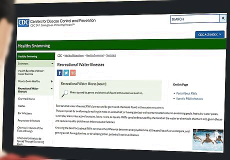 Be cautious of different water areas. Public pools are not the only area where you can contract RWIs. Despite the chemicals used in pools, the germs are still prevalent. This is true of any communal water source, so you need to be cautious of any public recreational area. In addition to the pools, other areas to be careful are: Splash pads Water parks Hot tubs Spray parks Rivers Lakes Water fountains Oceans