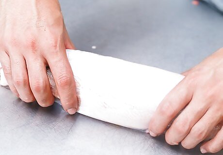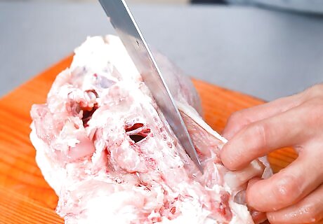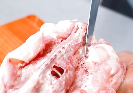 Begin working your knife down one side of the rib cage. Grasp the skin with one hand, and (carefully!) cut the meat away from the bone, pulling it free as you work. Start by grasping the skin next to the spine cut furthest away from you. Cut as close to the bone as you can, letting your knife do the work.