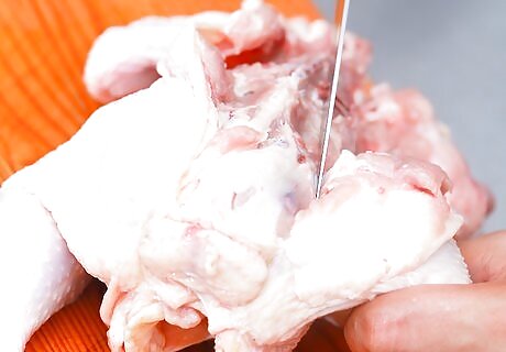 Pop out the wing joint and cut through it. Grasp the wing in one hand, and the area on the body around the wing joint with the other. Bend the wing back and twist it a bit until the joint pops, then cut through it with the tip of the knife. Locate the gap between the bone and the socket, apply a little pressure, and it should pop free with a little help. Continue working your knife down until you get to the leg.