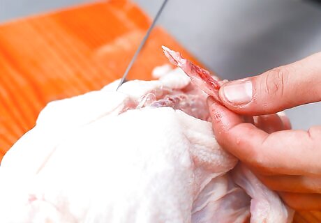 Remove the wishbone. As you start pulling the chicken away from the ribs, you'll encounter the wishbone quickly. Spin the chicken around so the neck hole is facing you, and work your knife around the wishbone to loosen it, pulling it free. The wishbone is famously easy to break, and might snap as you try to get it out. That's fine, but make sure you get the pieces and be careful of bone shards as you work.
