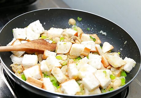 Stuff your chicken, sew it up, and roast it. The most popular use of the boned chicken is to stuff it with your favorite variety of stuffing, sew it up with kitchen twine, and bake it in the oven. For a basic recipe: Mix up your favorite stuffing using old bread, celery, onions, sausage, sage, or whatever ingredients suit your fancy. Liberally salt the inside and the outside of the chicken, as well as using pepper and other spices to taste. Spoon the stuffing onto the inside of the chicken. Using a needle of a paper clip, sew up the bird with the stuffing inside. Begin at the neck end and draw the string through both skin and meat on both sides, taking care to make sure it won't pull loose as it cooks. Tie a knot at the end to hold both sides together, then sew your way down the seam. Alternatively, you could sew the bird up before stuffing it. After you've trussed it up, rub the outside with olive oil or butter and roast the chicken at 375 degrees F (190 C) for 20 minutes per pound of meat.