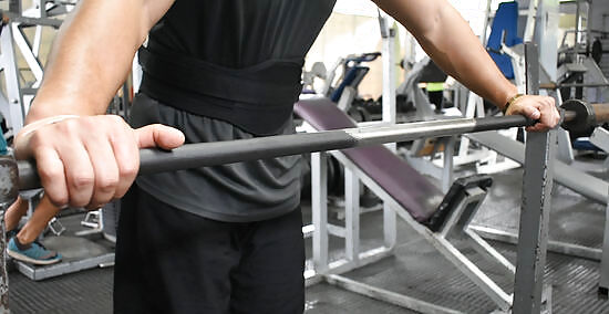 Pick up the bar. Grab the bar with both hands, a bit out from each shoulder. Scrunch your shoulders together. As you do, move your elbows forward. It's almost as if you are trying to wrap the bar around your shoulders like a cape. Take a deep breath, so that your abdomen is tight. Take the bar off the rack, keeping your lower back tightly arched.