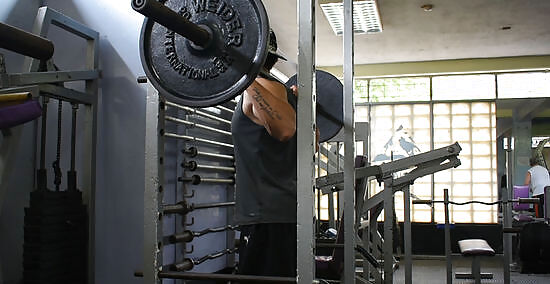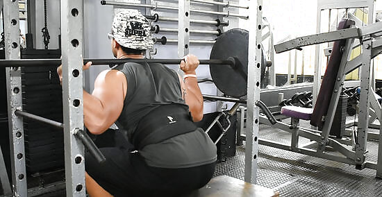 Continue or stop. You can continue doing squats, or you can put the barbell up now. If you want to put the barbell up, move forward and lift the bar onto the rack, then let go. If you want to do more, start with two reps at a time. Rest a minute or so before doing another set of reps.