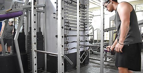 Set your feet at the right width. Your feet need to be at least shoulder-width apart for balance. At that width, you'll work your quads more. If you want to work your hamstrings, glutes, and back more, set your feet a little further apart.