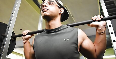 Move underneath the barbell. Begin the exercise standing. Step under the bar to situate it across the back of your shoulders.