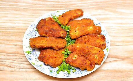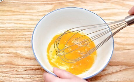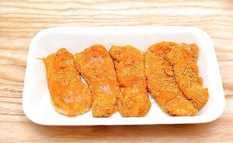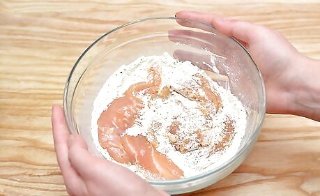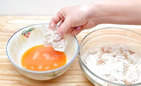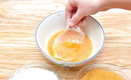 Dip your meat in the eggs and then dredge it again in either the flour or seasoned breadcrumbs specified by your recipe. Use your hands to press the coating onto the meat flesh or skin.
