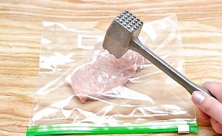 Flatten meat into cutlets using a tenderizing utensil. Follow recipe specifications, which usually call for half-inch or thinner pieces of meat.