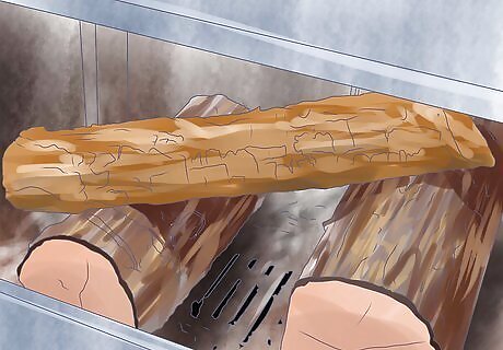 Place one cross-bar across the two large logs. This log should be about the diameter of your forearm, and it should rest parallel to the pane of the glass door or fireplace opening, closer to the opening of the firebox. This cross-bar will hold the other firewood and keep an air vent open where the fire can draw fresh air to feed it from underneath.