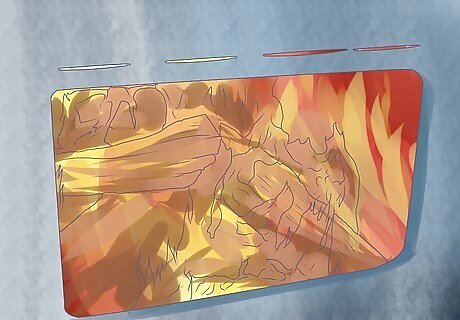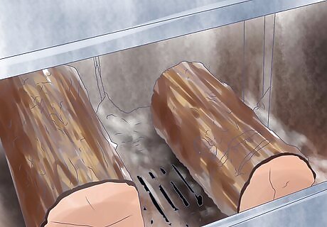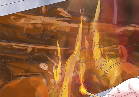 Stack one or two larger logs on top of your kindling base. Depending on your kindling placement, you may be able to fit a couple of logs over your kindling securely. Generally, opt for smaller logs over larger ones. Larger logs may look nicer and be more fun to burn, but they have larger surface areas, making them tougher to catch fire. Two logs that are equal in size to one is almost always preferable. Stack the wood at most to two-thirds of the height of the firebox. You don't want your fire to rage out of control when you light it.