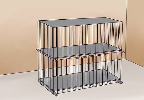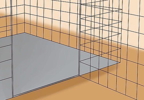 Plan a design. Purchase two boxes of wire storage cubes. Once you remove all of the wire mesh grids from the boxes of storage cubes, you'll know how many you have to use. Each grid square will likely be 13”x13” or 14”x14” depending on the brand you buy. A common design may consist of front and back walls that are both three grids high and three grids long with side walls three grids high and two grids deep. This design gives you space to build two or three levels up for your rabbit without commandeering a large portion of any room.