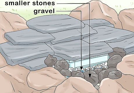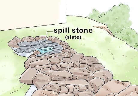 Place the spillway rocks carefully. Slate makes for an excellent spill stone. Don't be afraid to use smaller stones or even small pebbles to create the base for your spillway. Here are some other things to keep in mind when building spillways: If you're having trouble keeping your spillway stone in place, sometimes a larger stone on top of it will anchor it in place while you build its base. Always measure the slope of your spillway with a level. This is important for two big reasons. First, going front to back, you'll want your spillway stone to be either level or sloped slightly downward; if it's sloped upward, water isn't going to travel down it nicely. Second, going side to side, make sure your spillway stone is level; this will ensure that the water travels over the entire surface evenly and doesn't pool on one side. Small cobblestones or rocks jutting out from beneath spillways can give accent to an otherwise uniform waterfall.