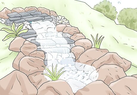 Choose a location. You can install a waterfall on a natural slope or hill, or you can dig out the slope yourself. Alternately, if the soil or foundation you're digging into is difficult to excavate, consider building the stream above ground using a combination of rocks and gravel as your base. How much of a slope will you need? The absolute minimum slope you need is a 2 inch (5cm) drop for every 10 feet (3m) of stream. Of course, the steeper the slope, the faster the water runs and the louder the sound of the waterfall.