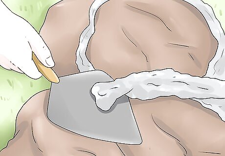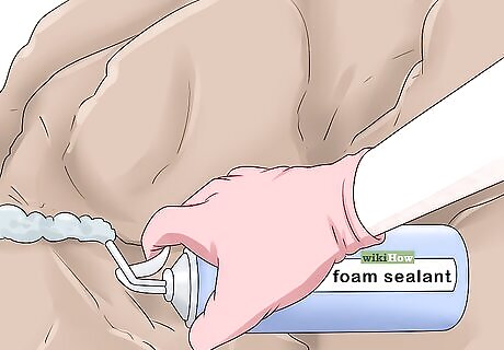 Foam in between any small cracks and crevasses using a specially-made dark foam sealant. Foam sealant works best on cool and damp stone surfaces, so mist your stream and waterfall if necessary beforehand. Start spraying only a little at a time as you begin; the foam may expand more than you anticipate, and once it's applied, it's harder to remove en masse. Although other foam sealants can be used in place of specially-made waterfall sealants, they do contain toxic chemicals that are harmful to fish. So if you're planning on introducing fish into your pond, be sure to use one that's specifically designed for use alongside fish. Give the foam at least 30 minutes, and up to an hour, to dry completely. If you're ready to, you can finish foaming and start your waterfall easily in the same day. Consider sprinkling neutral-colored gravel or sediment on top of the drying foam. This will disguise the black foam and cause it to blend into the surroundings more. When foaming, wear gloves and be sure to wear something that wouldn't mind throwing away. If you accidentally get foam onto a boulder, you can easily wait for it to dry and then scrape it off.