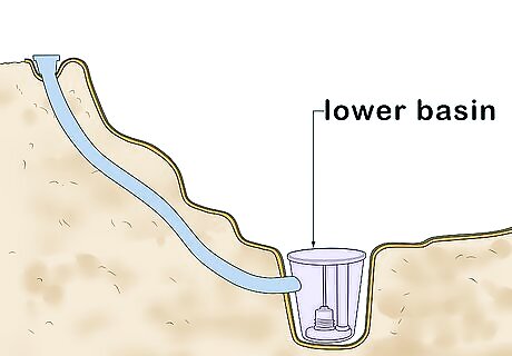 Set up your lower basin. Drill holes into your sump basin if it doesn't already come with them. (See below for more instructions.) Place your sump basin into the excavated hole at the bottom of the waterfall, above the underlayment and liner. Insert the pump to the sump basin, connect the water line, and make sure the hose extends all the way up to the upper pool. Once the basin is set up, secure in place by adding layers of small - medium size stone (not gravel) around the basin. Attach the lid of the sump basin. Some sump basins will come already perforated, but many will not. Basins need holes to allow the water to come in. If you need to perforate the basin yourself, the job isn't difficult. Starting from the bottom, drill a hole into the side of the basin using a 2 inch bit. Moving around the side, drill a hole every 4 inches. After you've drilled around once, move up an inch or two and continue drilling another revolution. When the bottom third of the basin is perforated, graduate to a 1 inch bit for the middle third section, and finally a 3/8 inch bit for the top third. Stream waterfalls require a stronger pump and a longer hose than pond waterfalls, because they need more pressure to get water back to the beginning of the stream.